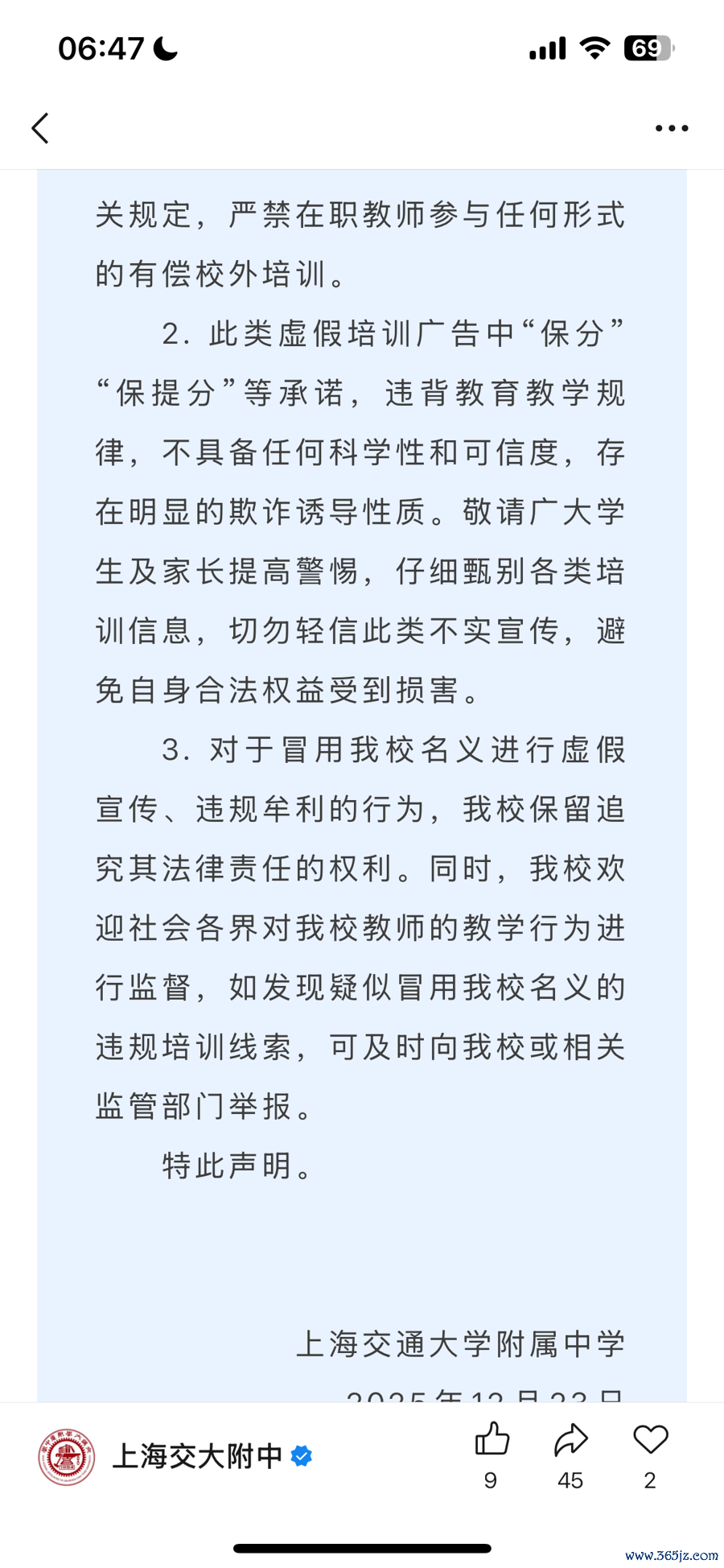针对社会上日渐增加的由“交大附中某老诚”讲课、并甘心“语数英保135+”“保提分”的校外培训电话倾销告白,12月23日,上海交通大学附庸中学在其官微发布严正声明,明确该举止与学校无关,系冒用校名的弊端宣传,并保留讲求联系东说念主员法律连累的权柄。